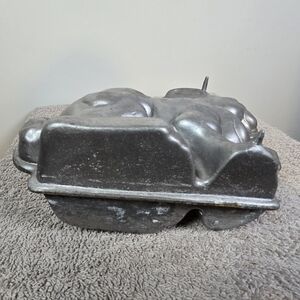 This item is a vintage lamb-shaped cake or chocolate mold, made of cast aluminum, used for holiday baking.