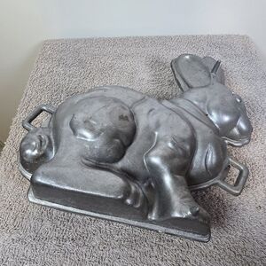 Structure: Consists of two halves that fit together to form the complete lamb shape. The bunny mold is approximately 11 inches wide 10 inches tall and is in vintage condition.