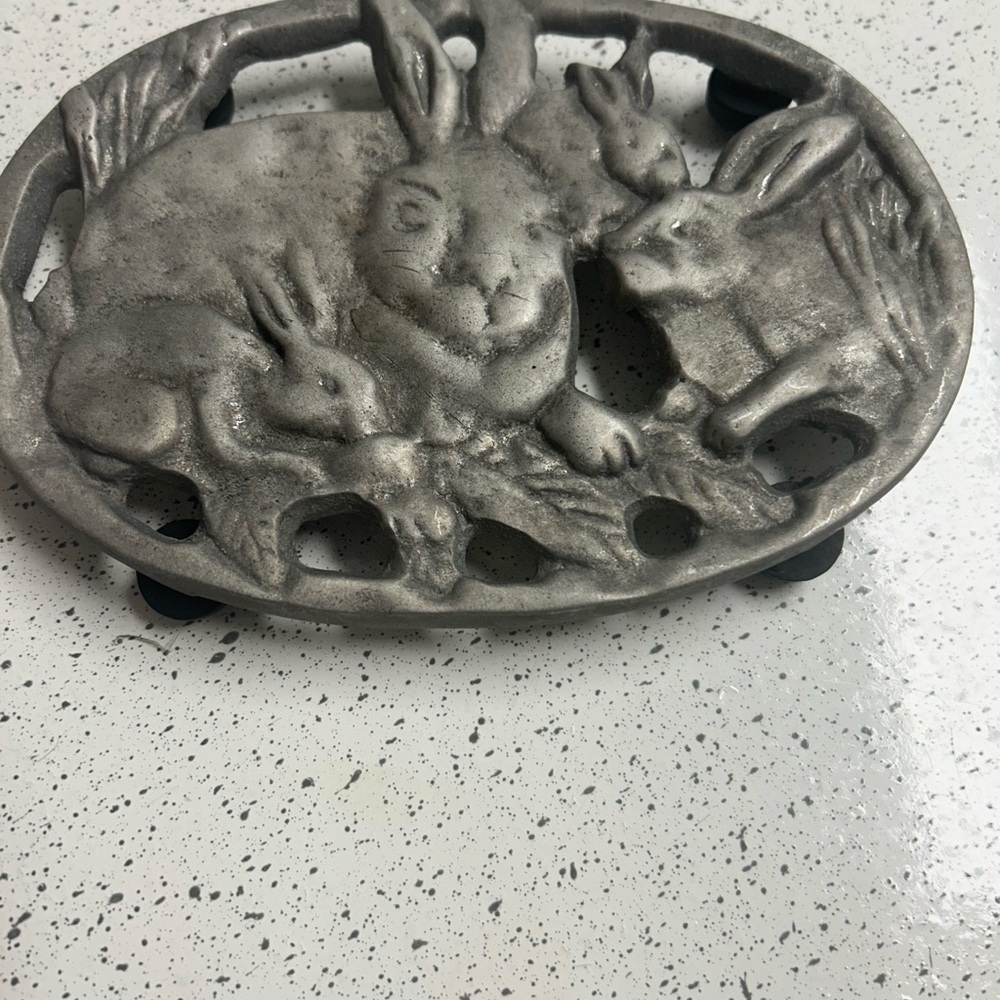 Decorative silver trivet featuring rabbit design. Perfect for kitchen or dining decor.