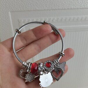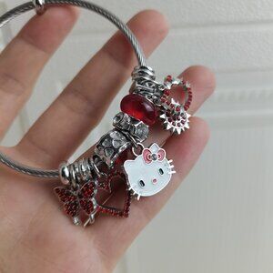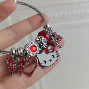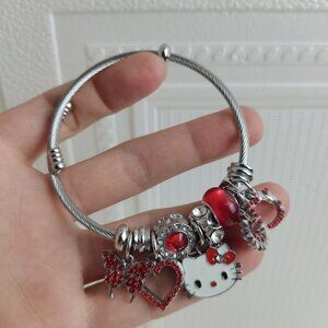 Silver & Red Hello Kitty Charm Pendant Tone Bangle Bracelet