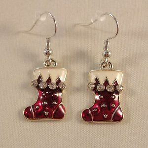 New women's beautiful handcrafted classic silver red Santa boots stockings with white crystals drop dangle earrings. Red + white hand oil painted with white simulated diamond crystals. Hypoallergenic, high polished shine, brand new, never been worn. Lead, nickel free. These gorgeous earrings sparkle.