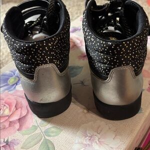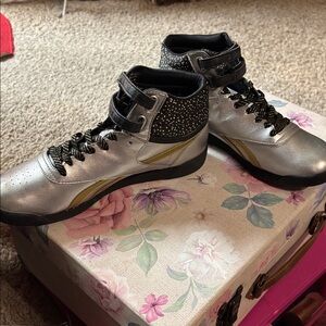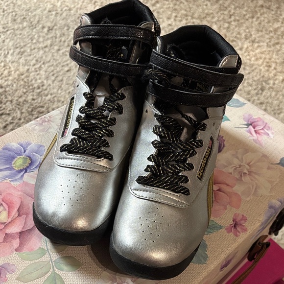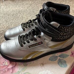 Silver Reebok hightops big kids size 7 fits women size 8. In great condition. Tread is close to new, one small scuff on heel