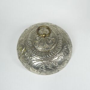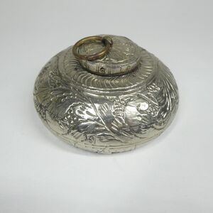 Vintage silver pot with lid. Interior appears to be wooden, with a silver overlay with beautiful repousse designs. Round shape, about 3.5 inches in diameter and 2 inches tall. Unsigned; believed to possibly be an opium pot from India, though it could also be used as a trinket box. Not marked with a metal content, so I do not know if it is real silver. Good shape overall with some surface wear, and a rectangular spot of sticker residue on the underside.