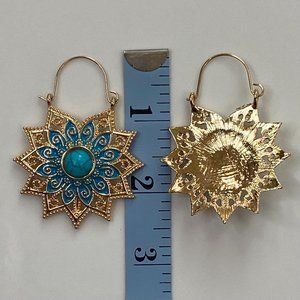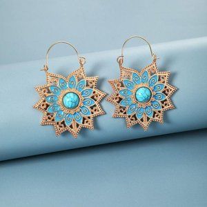 Silver Retro Sunflower Turquoise Dangle Earrings. Retro ornate sunflower geometric design dangle earrings in turquoise blue color. Approximate drop: 2.5" Bright gold-tone finish Hinged back closure Boutique item comes in manufacturer packaging. Similar versions are available in my Boutique. Offers encouraged! Bundle for best savings. I will ship the same or the next day. Like items for price drops.