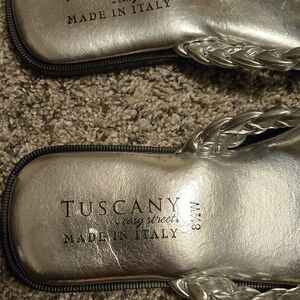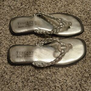 Stylish silver sandals with rhinestone detail. Perfect for any occasion.