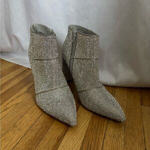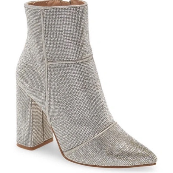 New with tags Steve Madden silver rhinestone heeled ankle booties. Have a pointed toe and side zipper. In excellent condition. There are some small spots of discoloration that is shown in the last few photos.