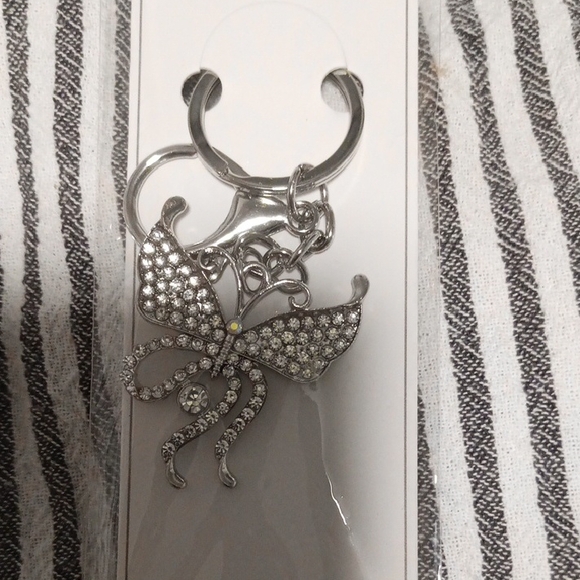 Elegant silver butterfly keychain adorned with sparkling rhinestones. Perfect for adding a touch of glamour to your keys.
