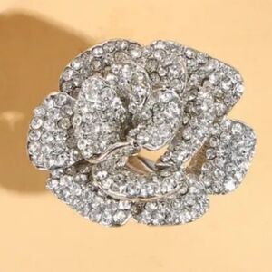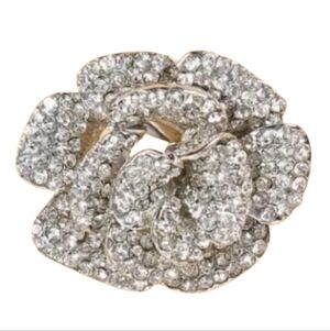 Make a statement with this dazzling rhinestone camelia ring. The intricate floral design and sparkling rhinestones create a glamorous and eye-catching accessory. Perfect for adding a touch of elegance to any outfit, this ring is sure to turn heads. Size 8.
