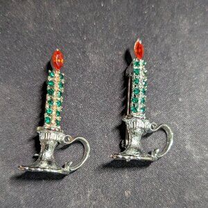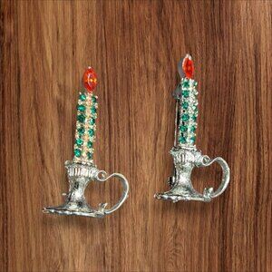 Silver Rhinestone Candlestick Brooch Set Red Flame Green Accents 2 Inches Vintag
