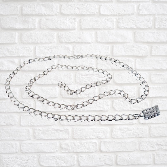 Simple and chic silver chain belt that has 3 rows of rhinestones. 36 1/2” long.