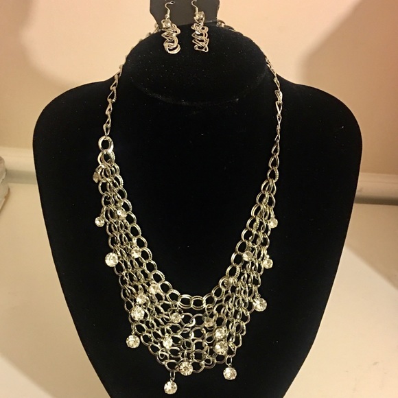 Fishing for Compliments is a gorgeous layered silver chain necklace accented with beautiful moveable rhinestones and matching earrings. It has adjustable clasp closure. This can be worn low or as a choker necklace.