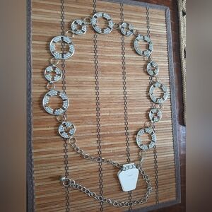 This elegant silver circle belt adds a touch of sophistication to any outfit. Perfect for dressing up jeans.