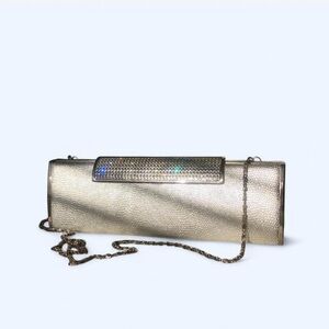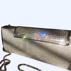 Silver rhinestone clutch bag with metal strap and snap closure, perfect for a night out !