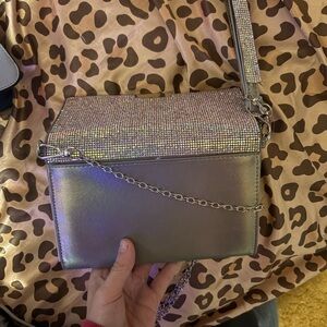 Elegant silver clutch bag adorned with sparkling rhinestones. Perfect for evening events and special occasions.