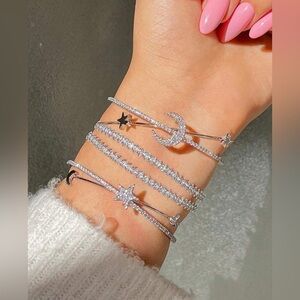 Elegant silver bracelet with a crescent moon design. Features sparkling accents and star details.