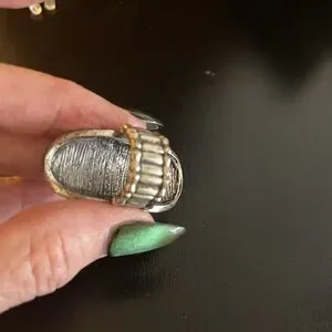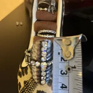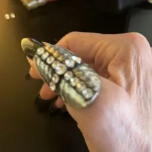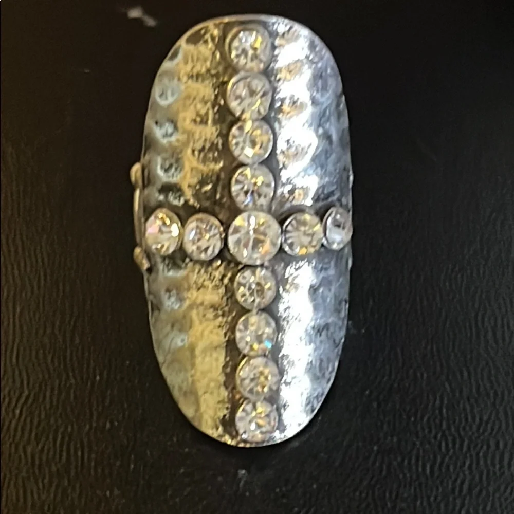 Elegant silver ring with rhinestone cross design. Perfect for adding sparkle to any outfit. Big and bold watch band style very comfortable vintage have had for years gorgeous rhinestones very Blinky hammered effect gorgeous costume. Jewelry can wear from a size 5 on up. Excellent pre-loved condition. Unisex.
