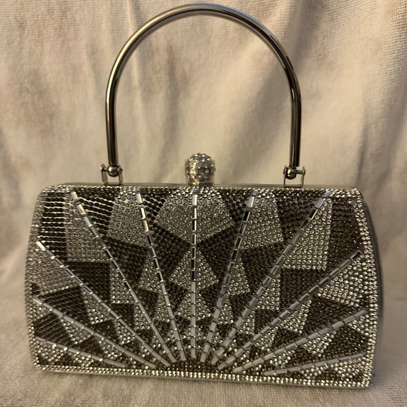 Elegant silver handbag adorned with rhinestones. Features a sturdy handle and intricate design. Never used.