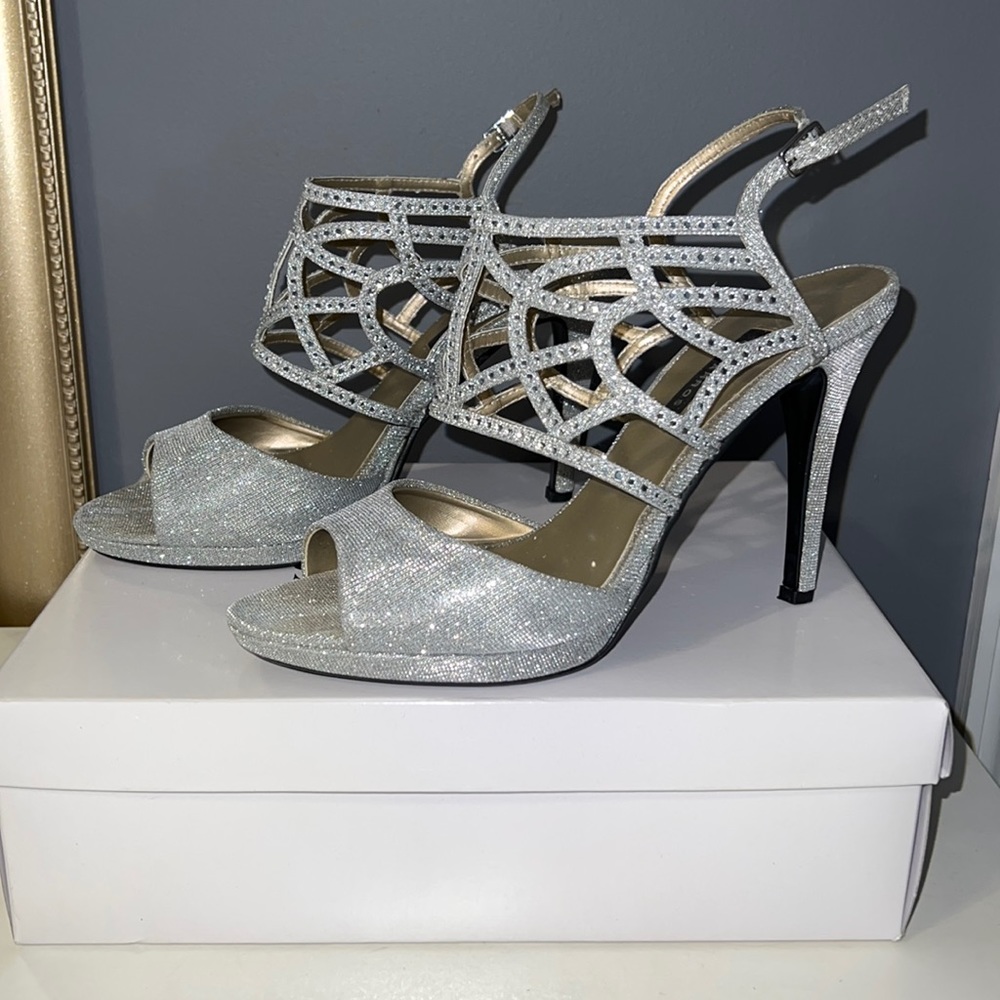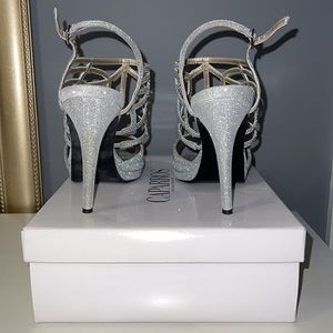 Silver rhinestone heels with ornate ankle design. Open toe with adjustable ankle straps. 4 inch heels. Come with original box!