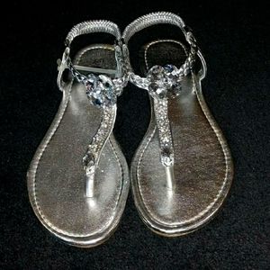Silver thong sandals with rhinestones all the way up the strap to the ankle and a large flower rhinestone at the top of the sandal, this is a slip on sandal with an elastic back strap to secure the sandal on your feet comfortably... This sandal is practically new only worn for three hours...They are sparkly and beautiful perfect after a pedicure... AWESOME BUY!!🔥🔥🔥🔥PRICE FIRM...