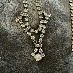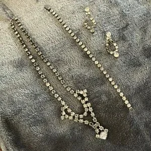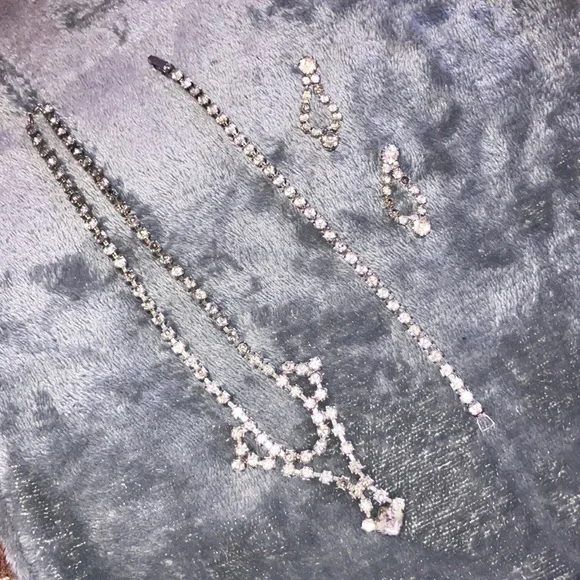 This exquisite silver rhinestone party set includes a necklace, bracelet and earrings. Stones vary in shades of clear to smokey. Classic vintage look of elegance.