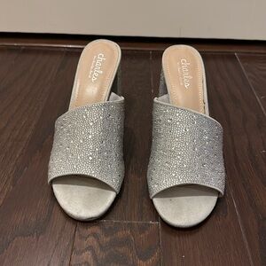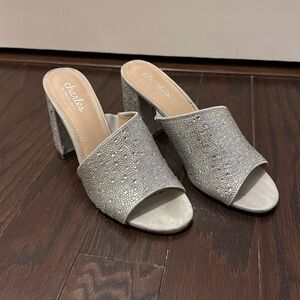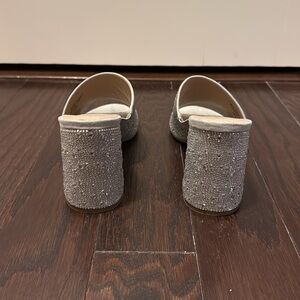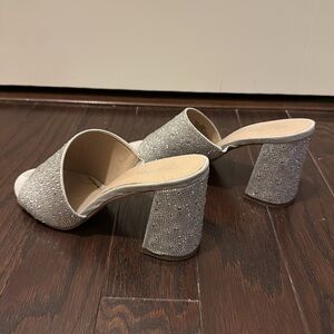 Light silver shoes covered in rhinestones with a block heel. Worn once inside for an event and I just don’t wear heels that often. Size 8.5, true to size and the block heel makes them easier to wear. In great condition!