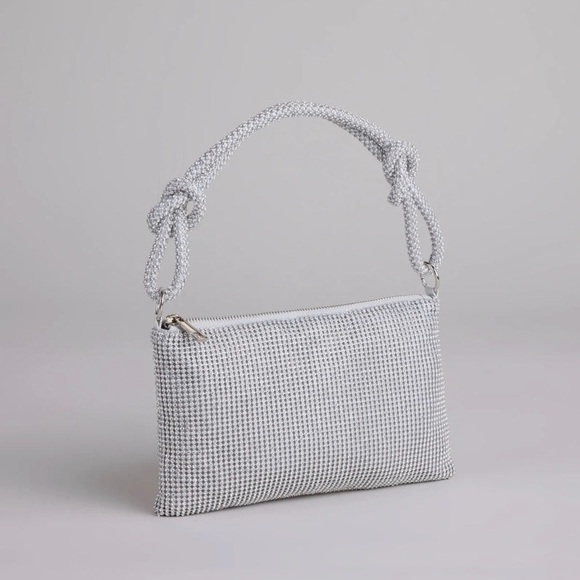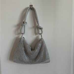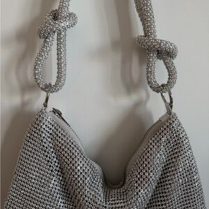 Silver rhinestone shoulder bag with knotted handles. Features a slouchy shape, full rhinestone detailing, and a zipper closure. Perfect for nights out or special occasions. Great condition.