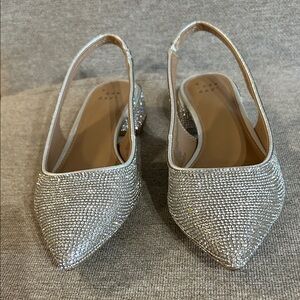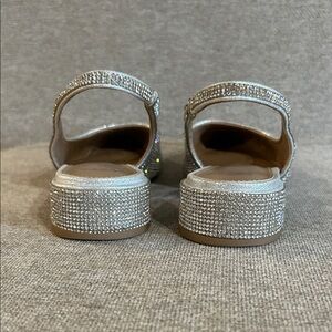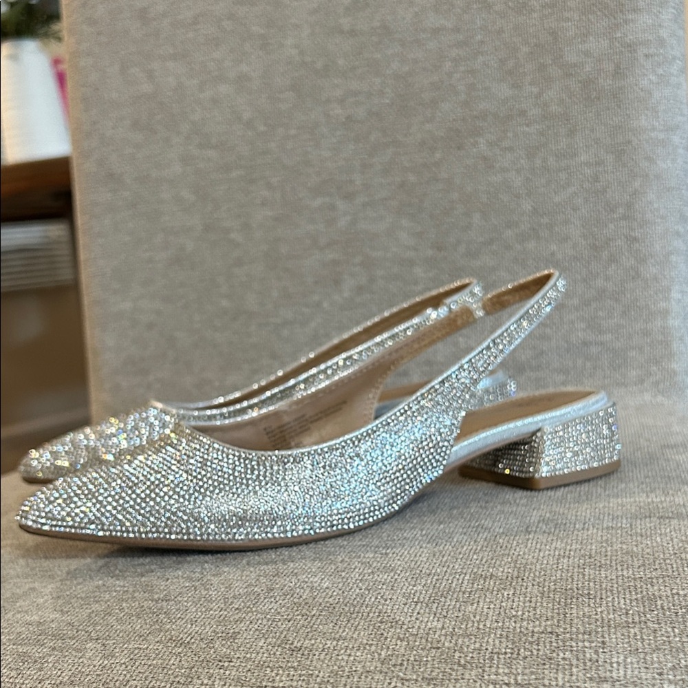 Step out in style with these elegant silver rhinestone slingback flats with a block heel. Perfect for any occasion, these shoes add a touch of glamour to your outfit. 🪩 great condition!