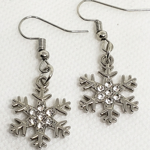 Silver rhinestone snowflake dangle earrings handmade by me. Perfect for a personal one of a kind Christmas gift or to wear for winter and the holidays!