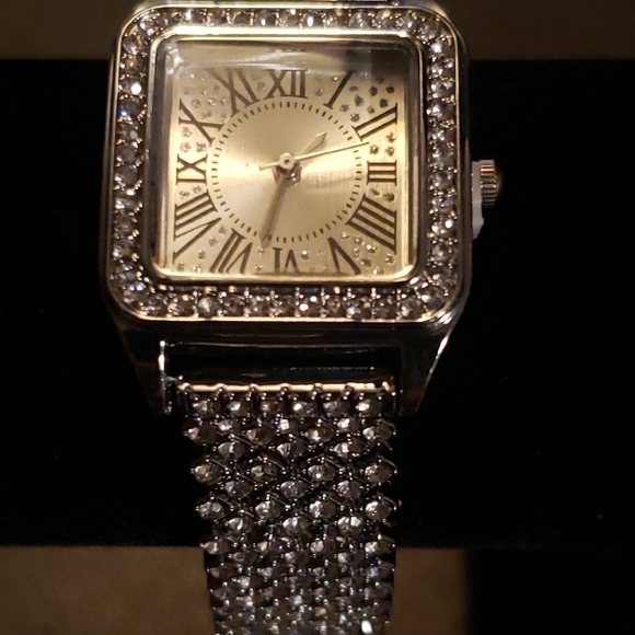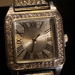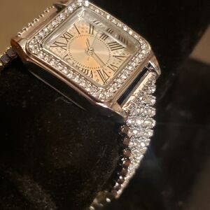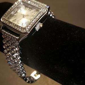 Elegant silver watch with rhinestone accents. Square face with Roman numerals. Perfect for any occasion.
