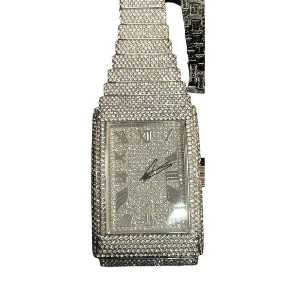 Elegant silver watch adorned with sparkling rhinestones. Rectangular face with intricate detailing.