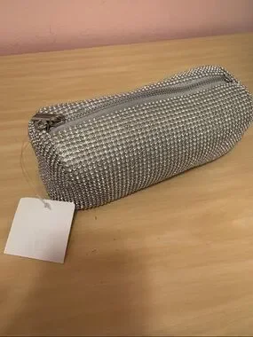 Silver Rhinestone Zip Pouch
