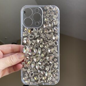 This luxurious silver phone case is adorned with sparkling rhinestones, creating a dazzling and glamorous look. The case features a textured, three-dimensional design with a clear camera cutout for easy access. Perfect for adding a touch of elegance to your smartphone. This case is clear and only has a white background for you to see the details. It fits an 16 Pro max.