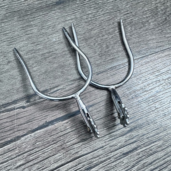 Pair of sleek silver riding spurs. Perfect for equestrian enthusiasts.