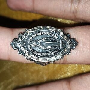 silver ring featuring a detailed religious pendant. Perfect for adding a touch of spirituality to your style.
