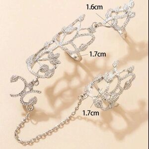 Silver Attached Ring Set for sale! This ring set is so beautiful! It is new, has never been worn, and is from my boutique! This sale comes with 2 rings in total that are attached with a chain. They all are different sizes, as shown in the last picture in centimeters, and are non adjustable. I bought one for myself, and love it so much. I am a size 7/8 on my pointer finger, and a size 8/9 on my thumb. It fits perfectly. They are made out of silver plated stainless steel. Such beautiful rings to add to your jewelry collection!