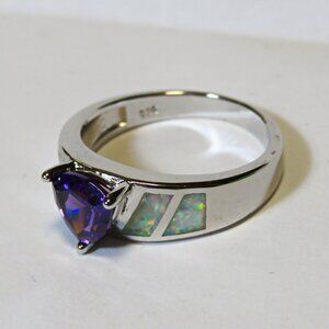 Silver Ring Size 7 White Lab Fire Opal Inlay 6mm * 6mm Amethyst New Old Stock