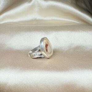 This artisan handmade silver ring features a polished round Willow Creek Jasper gemstone, admired for its soft beige, cream, and pinkish tones with natural swirling patterns. The stone is bezel set in sterling silver, allowing its earthy beauty to stand out with timeless elegance. With its unique and artistic style, this ring is perfect for both everyday wear and special occasions.