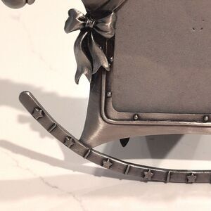 Silver Tone Rocking Horse Picture Frame that holds a 3" x 4" photo. This beautiful horse picture frame features a bow around the neck, a heart on the horse's back, fluffy hair on its head and tail, and stars on the bottom rocker. The details on this frame are incredible!
