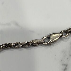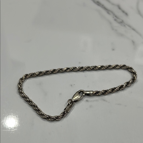 Sterling silver rope chain bracelet. I used to wear it every day: It’s sturdy, durable, versatile, and stylish. Couldn’t take a legible picture but it’s stamped “925 ITALY” on both clasp ends. Including the clasp, it is 7.25inches from end to end. It would look great with a David Yurman bracelet.