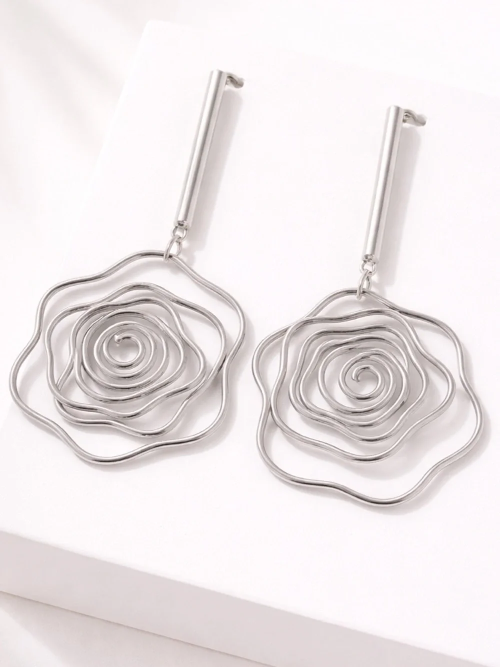 Silver Rose Wire Drop Earrings | Minimalist Statement Floral Dangle| Lightweight