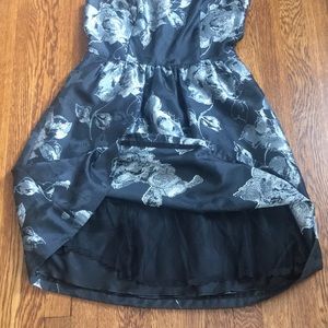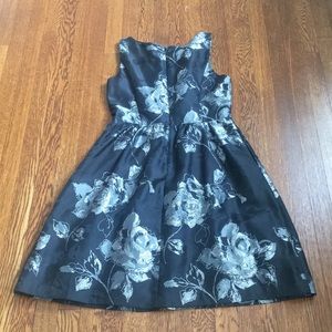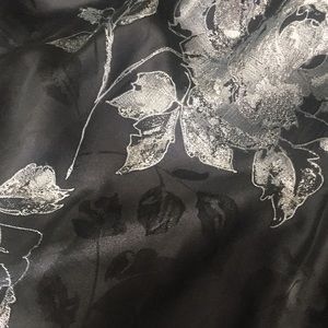 Just beautiful. Perfect for a celebration. Very 50s Mad Men inspired jacquard fit and flare dress. Silver metallic flowers in a black background. Excellent condition. Sleeveless open v neck with 2 pockets in skirt! Attached satin crinoline slip. Back zipper. Purchased at retail from White House Black Market.