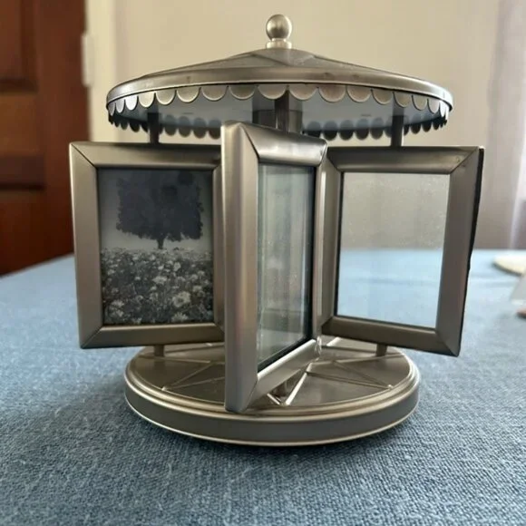 Silver rotating carousel photo frame. 5.1/2”H,5” across bottom,6”across top. Hold 8 photos. Frames measure 2 1/2”x 3 1/2”.