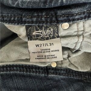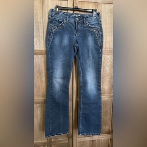 Women’s Silver SUKI 17” stretch boot cut embellished blue jeans. Size 27 x 31.
