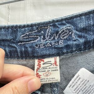 Casual light blue jean shorts by Silver Jeans. Features classic five-pocket style. Ideal for relaxed outings.