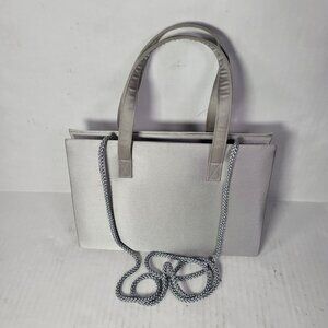 A polished silver satin handbag with a detachable chain strap, magnet closure, and a built-in compact mirror, ideal for formal settings.