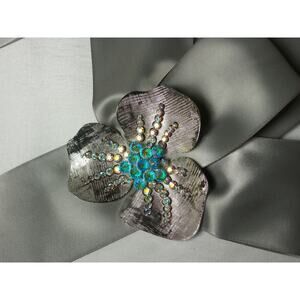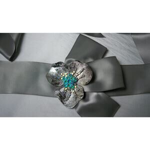 A very pretty silver double face satin belt. The silver bow has a beautiful rhinestone removable brooch. A pretty remembrance of your special day. The silver double face satin ribbon is 2 1/4 inches wide and 108 inches long.