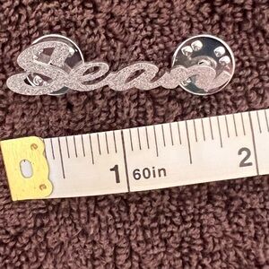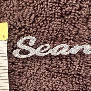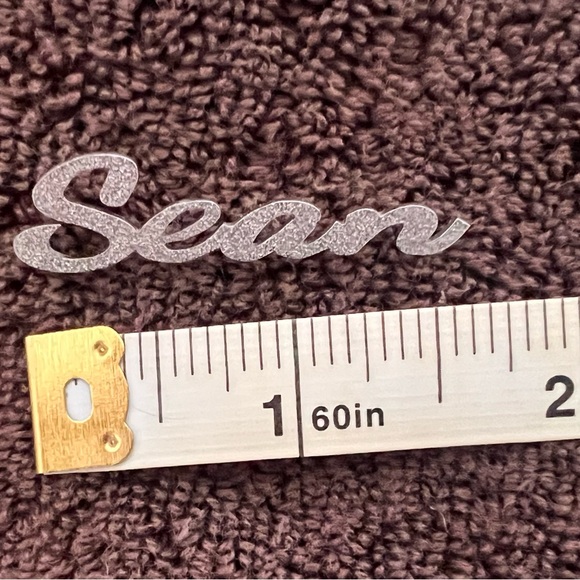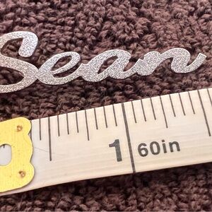 Silver-tone script nameplate charm reading 'Sean'. Textured surface catches light. About 1.5” long x 0.5” tall. See measurements in photos.