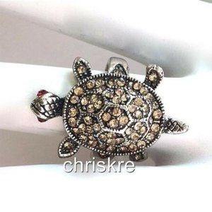 Silver Sea Life Turtle Cocktail Ring Size 6 Champagne Peach Crystals Plated Cute
