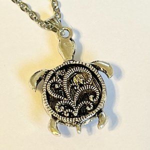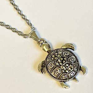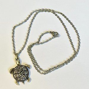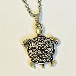 Silver Sea Turtle Necklace Marcasite Crystal Stainless Steel 20" Chain Plated