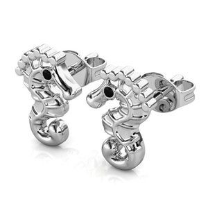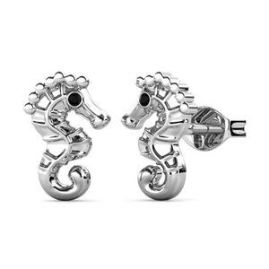 Cute Silver Seahorse Stud Earrings With Black Crystals